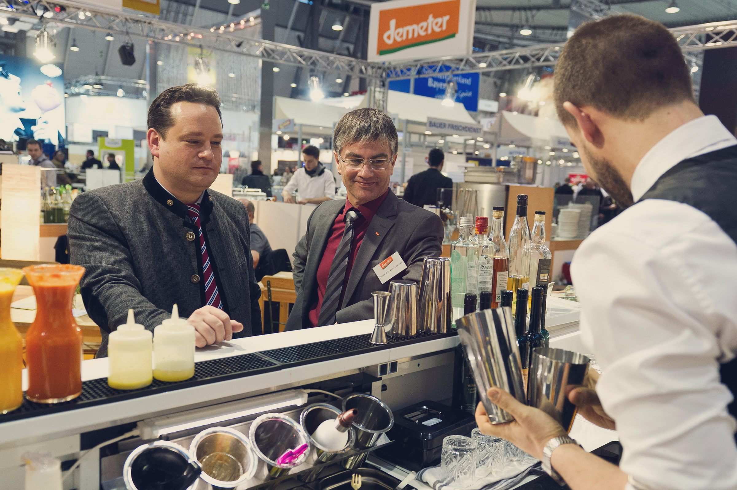 Auf der Fachmesse INTERGASTRA 2014 in Stuttgart konnten die Messebesucher erstmalig das neue mobile Bio-Bar-Konzept mit allen Sinnen genießen. Baden-Württembergs Landwirtschaftsminister Alexander Bonde besuchte den Blumberg-Stand. In Begleitung von Johannes Ell-Schnurr (Geschäftsführer Demeter BW) überzeugte er sich an Europas erster mobiler Bio-Bar von der hohen Qualität und vom charaktervollen Geschmack der verschiedenen Gemüsesorten und Früchte aus biodynamischem Anbau in Baden-Württemberg. „Vom Acker ins Glas“ lautet das Bar-Motto. Barkeeper Felix Haag kreierte aus roter Bete vom Michaelshof in Leinfelden-Echterdingen, duftenden Topaz-Äpfeln vom Demeter Obstgarten Rosenberg aus Heilbronn, Möhren vom Reyerhof in Stuttgart Möhringen und einem Spritzer frisch gepressten Staudensellerie feinste Bio-Cocktails -ein Genuss auch ganz ohne Alkohol.